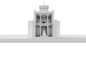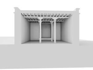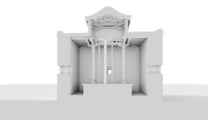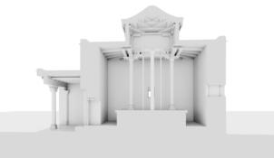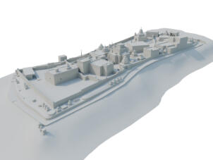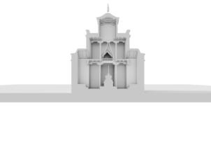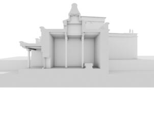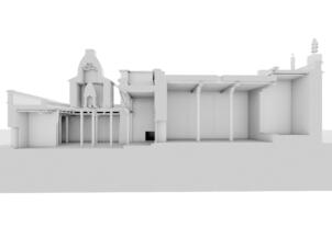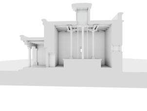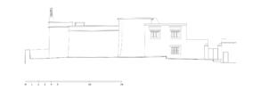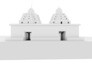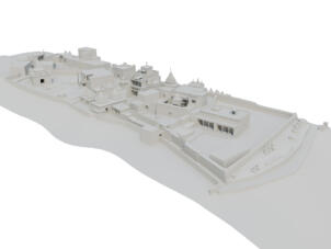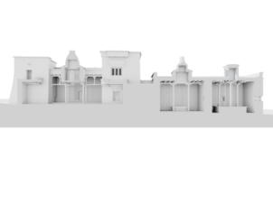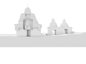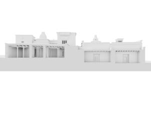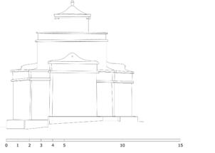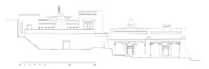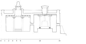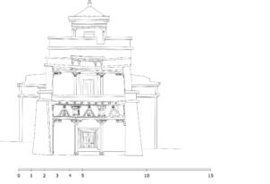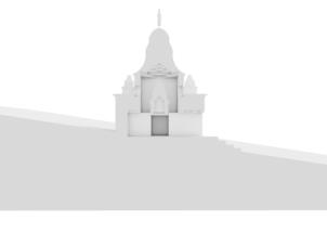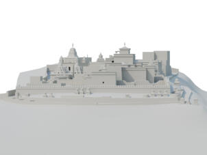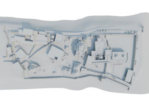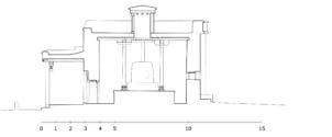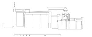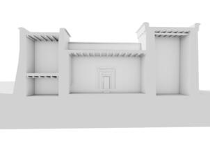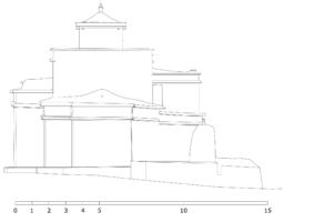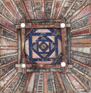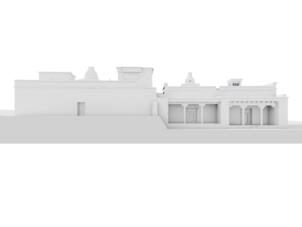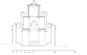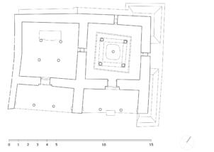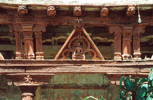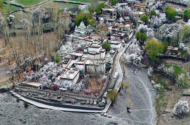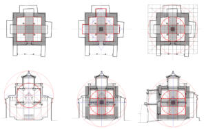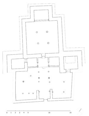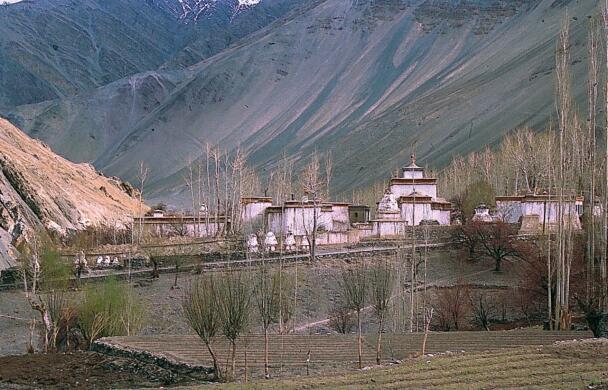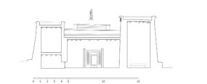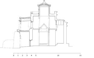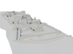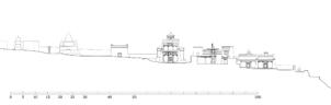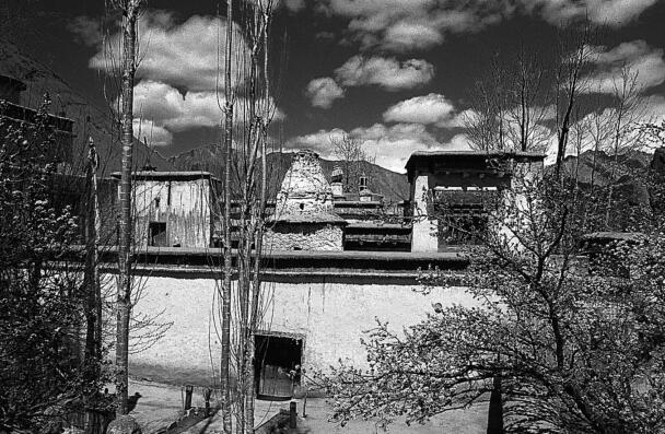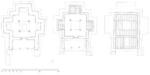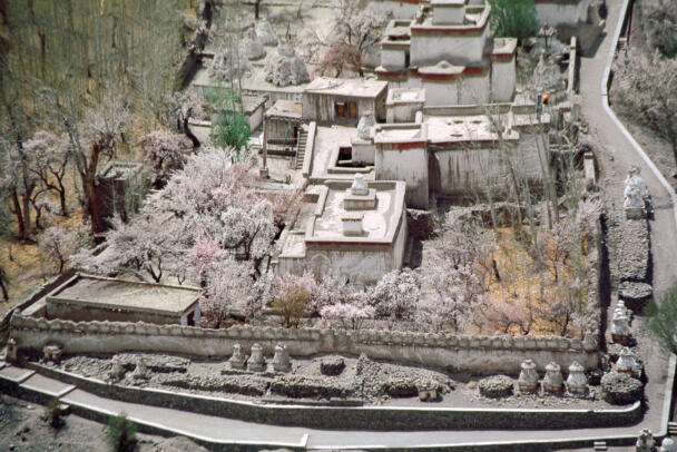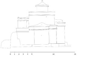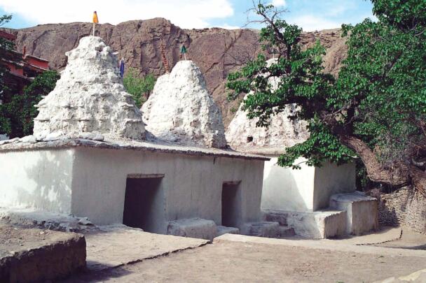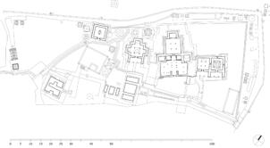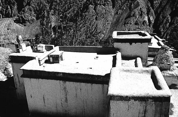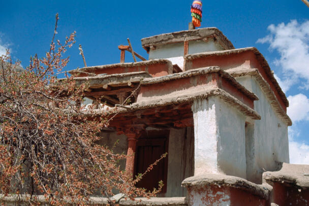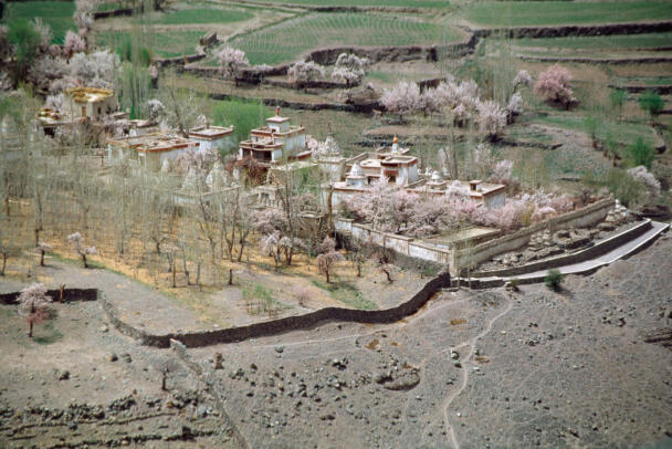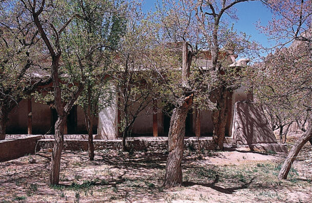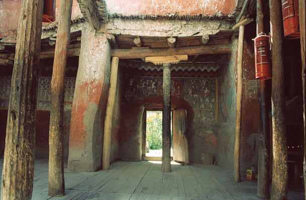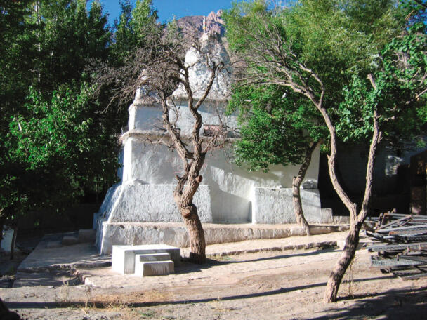 The monastic complex (choskhor) of Alchi is situated on a narrow hill section sloping continuously from southwest to northeast above the valley of the Indus river. Outside the fortified circumambulation path, the terrain to the northwest behind the Main Temple descends rather gently, while on the northeast side it drops steeply down toward the river. Following this outer path, which surrounds the entire complex in a clockwise direction, the sacred enclosure can be entered on the eastern side at the lowest point of the area. A narrow path from the upper gate along the western wall leads directly to the Lhakhang Soma. The wider, paved main path leads straight down from the Palden Drepung Chörten to the Tashi Gomang Chörten. Northwest of the Tashi Gomang Chörten is the strikingthree-storeyed Sumtsek with its open porch. The Main Temple is on the northeast side of the Sumtsek and next to it on the slightly lower terrain, the Lotsawa Lhakhang and the Jampel Lhakhang. At the back of the Main Temple stonewall fragments of the outer ambulatory around the temple are preserved. The main path leads around the Tashi Gomang Chörten to a gate, which leads to an open area in front of the Main Temple, which in the 1980s was still occupied by a building. In the northwest of this open space, in the middle of the facade, there is the entrance to a partially roofed forecourt that leads into the Main Temple. Following the stairs down on the northeast side, one finally reaches the lowest plateau, where again on the northwest side, the Lotsawa Lhakhang and the Jampel Lhakhang are located directly adjacent to each other. The orientation of all the temples varies slightly, each one of them is accessed on the southeast side. The Main Temple as a reference dimension deviates in its orientation – clearlydefined by the entrance and the apse – by 52 degrees from the geographical east. This deviation undoubtedly has to do with the topography of the temple area and the resulting peculiarities such as the time of sunrise and the visual relations to specific locations in the landscape.