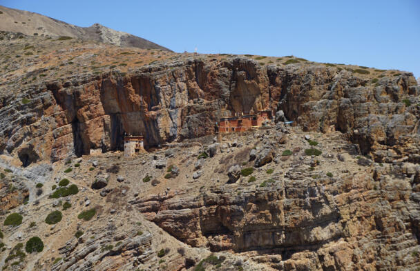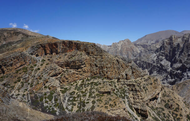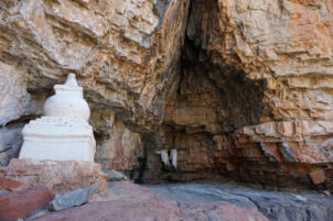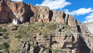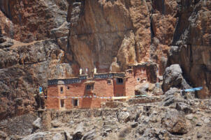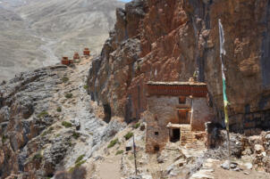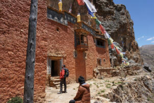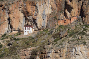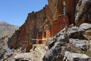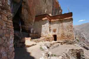 The complex is impressively situated and widely visible on the high-lying terraces in front of a steeply rising rock face on the northern side. The ensemble consists of a cave with a sacred spring, next to a three-storey, whitewashed residential building on the west side and – slightly higher located on the east side – the multi-storey, redwashed gompa. Both structures were built directly on the rock face with an open view over the valley towards the south. Some small chörten can be found next to the cave, along the access path and on the rocky edges.