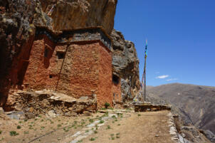 The Tsakhang Gompa (btsag khang dgon,“the house of red ochre”) is located about three kilometres northwest of Shey in the vicinity of the Crystal Mountain. Founded as a cave hermitage by Nyima Gyaltsen for solitary retreat in the late 16th century, it later turned into a place of religious activities and meditation practice. Together with the Shey Sumdo Monastery, also known as Crystal Monastery, which was founded in the 17th century, both buildings show the development of later temple typologies in Dolpo.