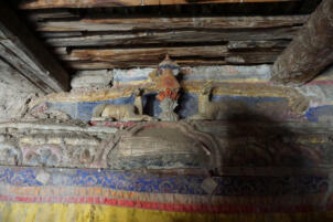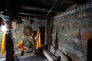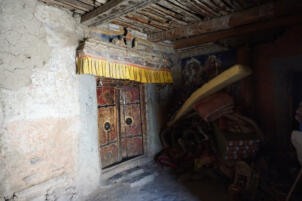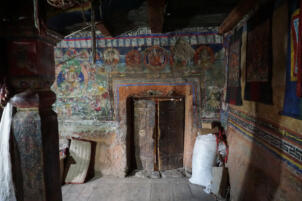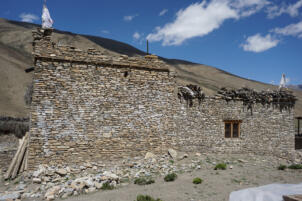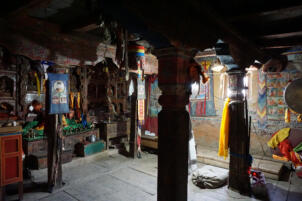 The Kagar Labrang or village gompa (kun-bzan čhos-glin) is the residence of the leading Lama of the Tarap Valley. The structure consists of two floors and a terrace roof. The entrance is situated on the west side of the building. The assembly hall occupies the southern part of the ground floor, its portal lies diagonally opposite the entrance and is decorated with a figurative depiction of two deer facing each other. A small chamber, which can be accessed from the anteroom, was separated next to it. So the portal is not in the middle of the assembly hall, but to the side. The hall is 5.70 metres wide, 7.20 metres deep and 2.60 metres high, the main beams of the ceiling are supported by four pillars. A window on the south side illuminates the room. The altar is located on the west side of the room, a shelf with books and statues cover the wall. The other walls are decorated with murals and paintings on canvas (thankas).