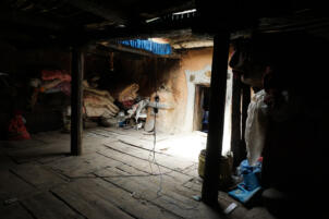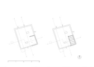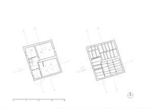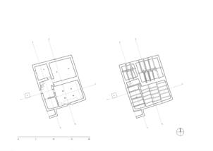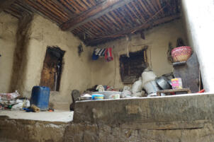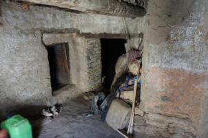 From the anteroom the staircase leads to the upper floor. Straight ahead the kitchen and a sleeping room are situated. On the right side from the stairs a door leads to the meeting room for the community. This part lies directly above the assembly hall. The ceilig is supported by four pillars. On the west side of the room one finds the entrance to the private chapel of Kagar Rinpoche, that contains his private libraray. It is 3.42 metres wide and 2.88 metres deep with a hight of 2.14 metres. One window lies on the western outside wall, another one on the northern side towards the anteroom.