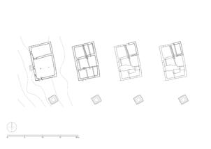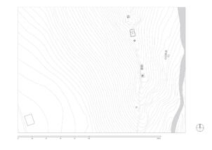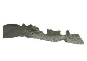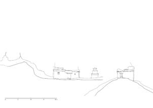 According the topography the temple is north-south oriented, with the entrace on its southern side. The structure consists of a small assembly room (5.30 x 5.90 metres) and an adjoining sanctuary (5.30 x 3.00 metres). The room height up to the fragmentarily preserved ceiling beams is between 2.00 and 2.20 meters. The outer walls are made of stone masonry and are up to 4.20 meters high on the north side – where the masonry meets natural rock – including the rooftop structure above the altar area. On the other facades the masonry ends at around 2.90 to 3.00 meters. A strong deformation of the rising masonry can be seen on the eastern facade, where the wall reaches down almost two meters below the floor of the assembly room to level the terrain. A bricked-up entrance opening to the assembly room is visible on the west façade.