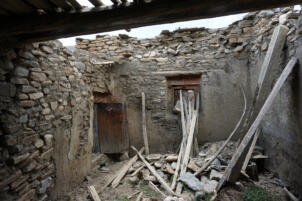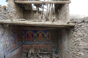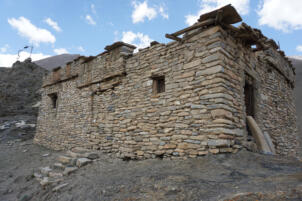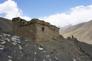 At the entrance of the temple, to the left of the door rises an elongated stone, a so called rdo-rin, a protective charm against thieves. About five years ago the roof collapsed, since then the building is exposed to the weather without protection (information from the responsible Lama Dargye, July 2023). In order to preserve this striking building, which towers over the village like a protection, we began looking for a sponsor for the renovation in the fall of 2023. Fortunately, Markus Weisskopf from Basel agreed to support the project. The structural measures could be completed in fall 2024.