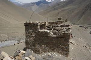 Seventy metres above the southern end of the settlement, overlooking the village and the valleys, a small gompa is situated, the so called Zur (Hill) gompa. From the settlement of Kagar a footpath leads along the grade of the ridge, accompanied by groups of chörten, which ends on a small plateau in front of the entrance. The family of Lama Dargye, whose home is in Tokyu, is responsible for the temple. Behind the temple is a rock formation with several small caves crowned with flags.