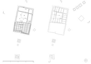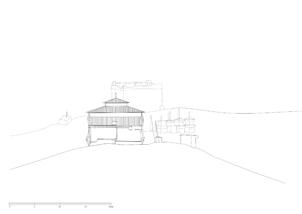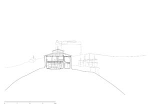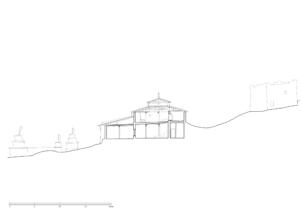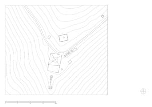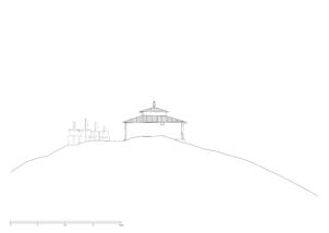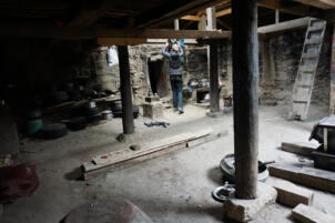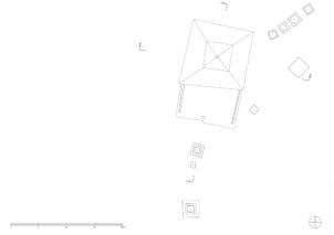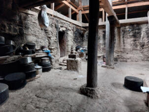 The upper floor is accessed via a stone staircase in the corridor next to the entrance. Above the meeting room on the upper floor is a communal kitchen for meetings and two small storage rooms. According to available satellite images, the new corrugated iron roof was only installed after 2017, both over the flat roof of the vestibule and the upper floor of the assembly hall to protect against rainwater ingress.