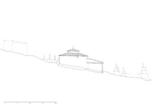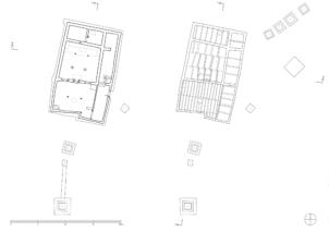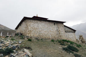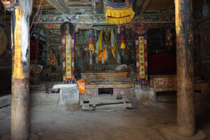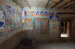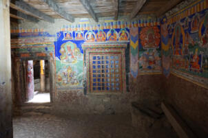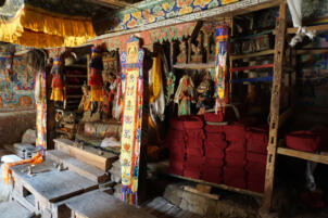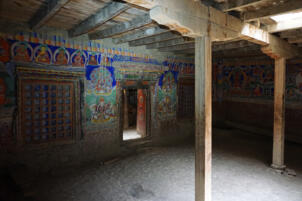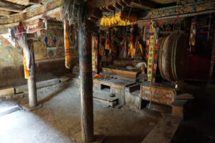 The temple was built on a slightly terraced site on the ridge of a slope and offers a wide view over the Tarap Valley from its forecourt. The entrance to the ground floor is on the east side of the building, from where a lateral corridor leads to the entrance hall in front of the assembly hall. From this spacious room – it is 7.00 meters wide and 5.20 meters deep – which was obviously added to the structure at a later date, you enter the assembly room on its south side. The assembly hall is up to 6.77 meters wide and 6.74 meters deep, with a room height of 2.33 meters. Four pillars support the ceiling construction. The altar is located on the rear wall, opposite the entrance. The interior is richly decorated and a large statue of Maitreya occupies the central area. A small opening in the rear wall behind the altar creates the spatial connection to a chapel of the protective deities behind it, which can only be entered by the lama via a trapdoor on the upper floor.