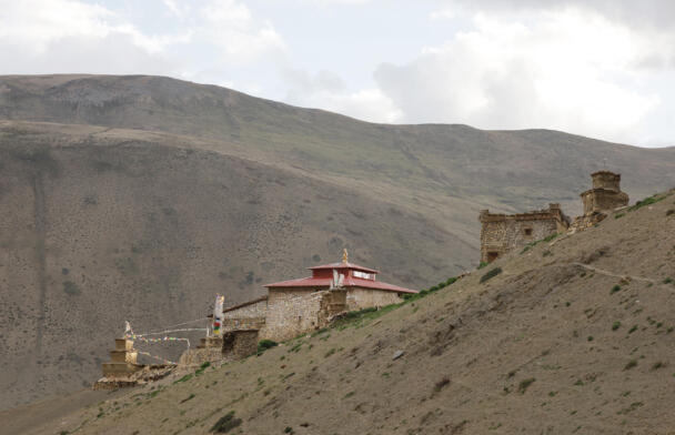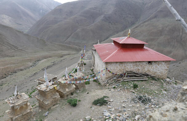 The gompa of Mekyem (ma-skyem dgon-pa) was built on a site called źu-lhags. Situated 1.5 kilometres southeast of Kagar, well hidden in a north-south running terrain incision, the gompa is located on a ridge north of the Tarap valley, about 170 meters above the course of the river. Coming from Kagar, a narrow path leads up from the main road by the school. Towards Dho Tarap, one path leads directly from the gompa steeply down to the river valley, another leads over the eastern hill towards Shipchok.