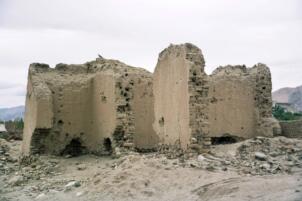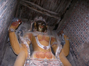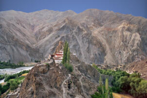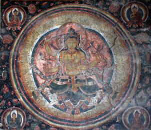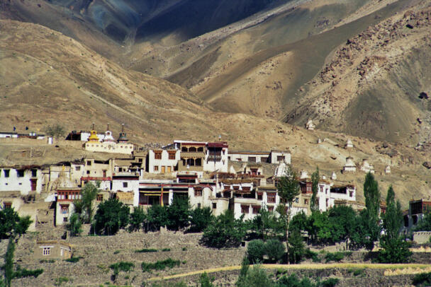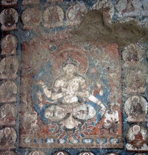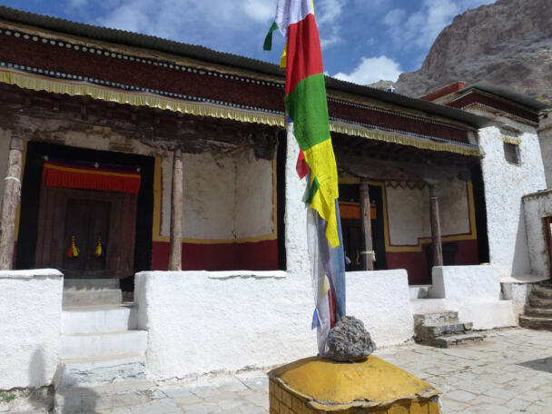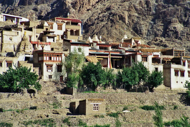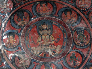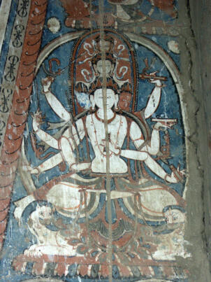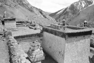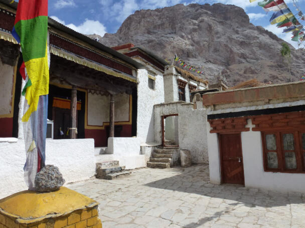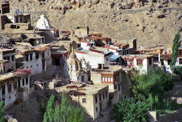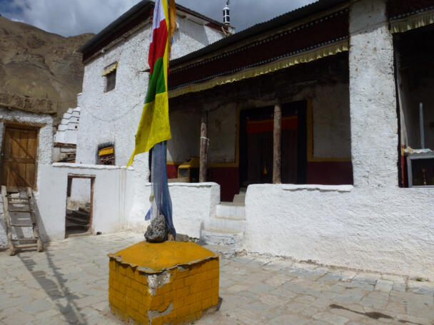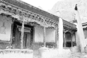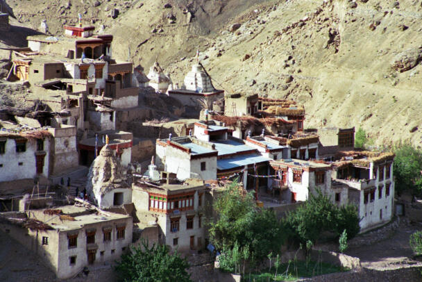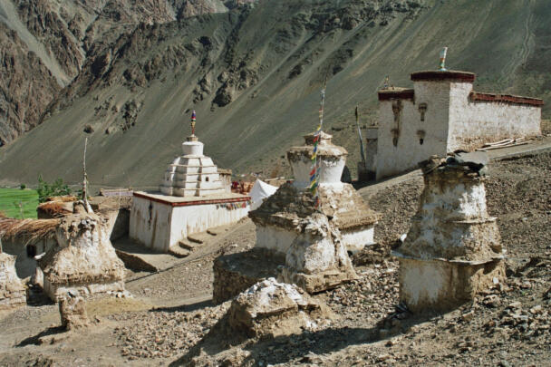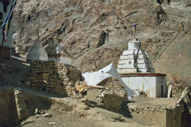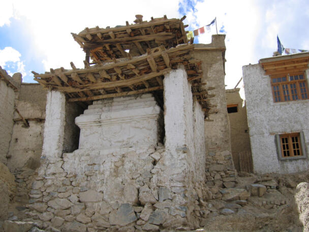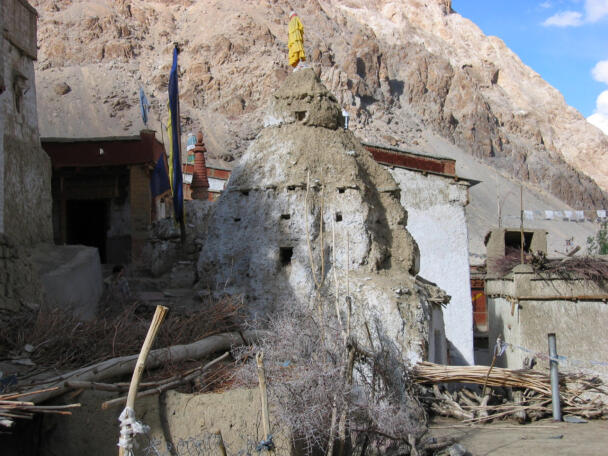 Mangyu is located about 50 kilometres (airline) west of Leh. The village is situated in a spectacular side valley of the Indus River valley. The upper part of the village consists of a number of houses situated above natural terraces with fields. This part of the village preserves the remains of a monastery attributable to the period from approximately the mid of the 12th century to the early 13th century. The temple complex comprises two temples facing southeast, situated adjacent to each other and two chapels on both sides of the temples. In front of the complex lies an open courtyard. The temple on the right side is dedicated to Vairocana. The other one, with a painted Sakyamuni as its original main image, though today named after the sculpture of a much later eleven-headed Avalokitesvara, lies on the left side. These rather small assembly halls are flanked by two high chapels with large, iconographically and stylistically different images of Bodhisattva Maitreya. The chapel to the side of the Vairocana Temple is considerably smaller than the one on the other side. At the south-western side of these structures lies a chörten of the Alchi type deriving from an earlier period. Further up on the slope of the hill and hidden behind some village houses on the northern side of the temple complex, another beautifully decorated chörten is situated. It is the only one in the group containing paintings and therefore called the Four-Image Chörten.