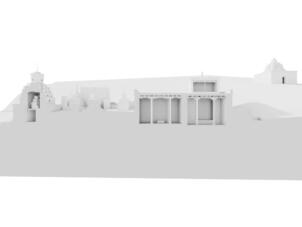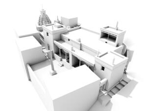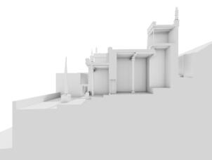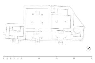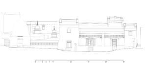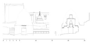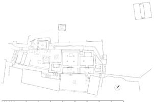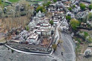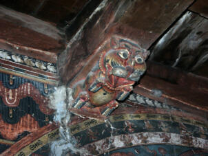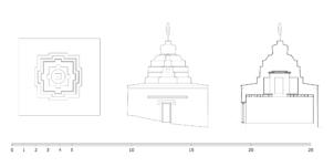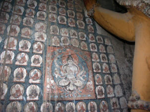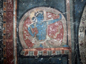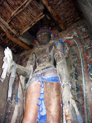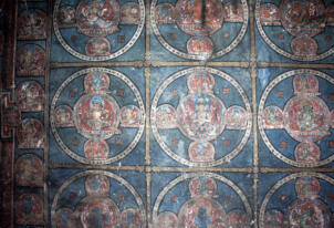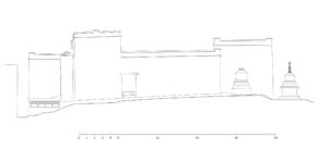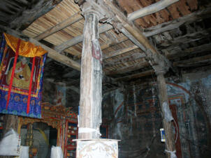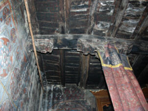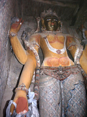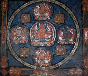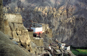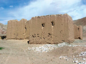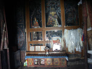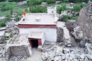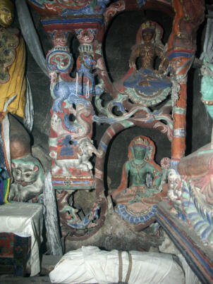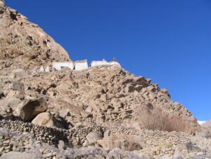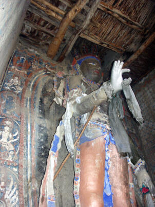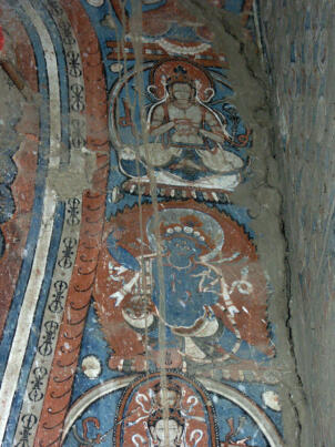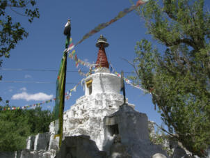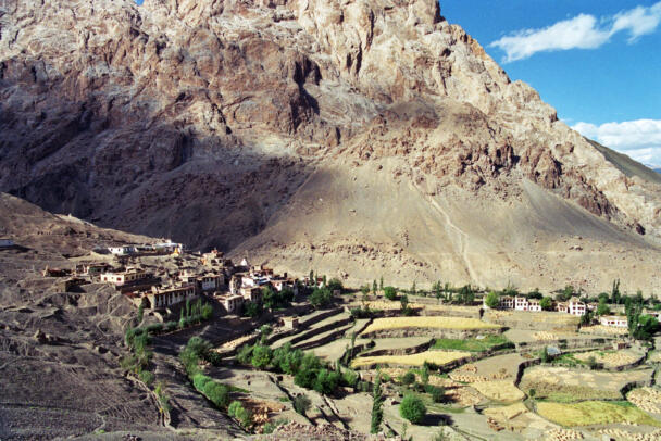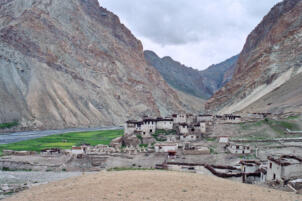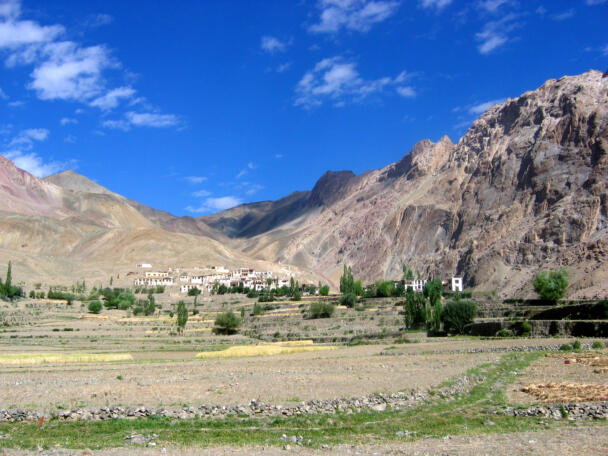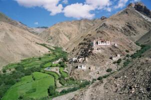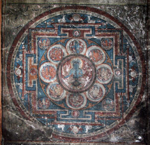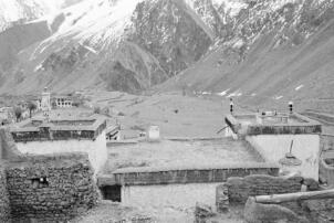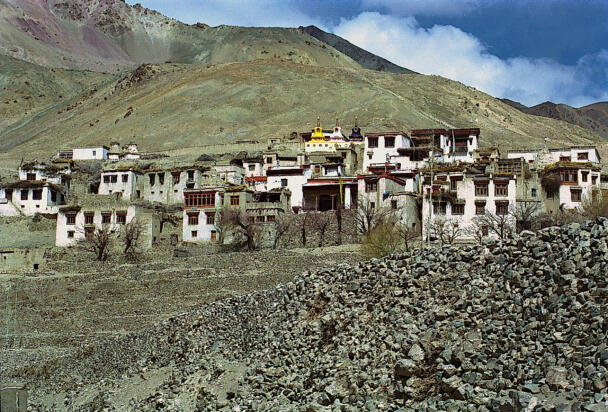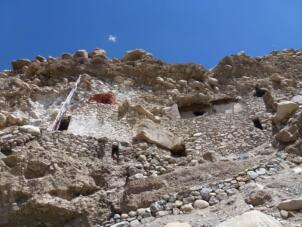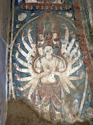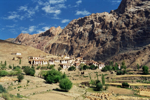 Mangyu is located about 50 kilometres (airline) west of Leh. The village is situated in a spectacular side valley of the Indus River valley. The upper part of the village consists of a number of houses situated above natural terraces with fields. This part of the village preserves the remains of a monastery attributable to the period from approximately the mid of the 12th century to the early 13th century. The temple complex comprises two temples facing southeast, situated adjacent to each other and two chapels on both sides of the temples. In front of the complex lies an open courtyard. The temple on the right side is dedicated to Vairocana. The other one, with a painted Sakyamuni as its original main image, though today named after the sculpture of a much later eleven-headed Avalokitesvara, lies on the left side. These rather small assembly halls are flanked by two high chapels with large, iconographically and stylistically different images of Bodhisattva Maitreya. The chapel to the side of the Vairocana Temple is considerably smaller than the one on the other side. At the south-western side of these structures lies a chörten of the Alchi type deriving from an earlier period. Further up on the slope of the hill and hidden behind some village houses on the northern side of the temple complex, another beautifully decorated chörten is situated. It is the only one in the group containing paintings and therefore called the Four-Image Chörten.