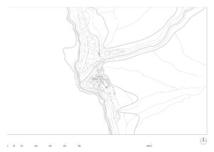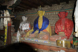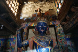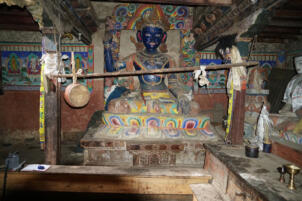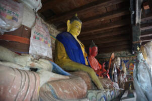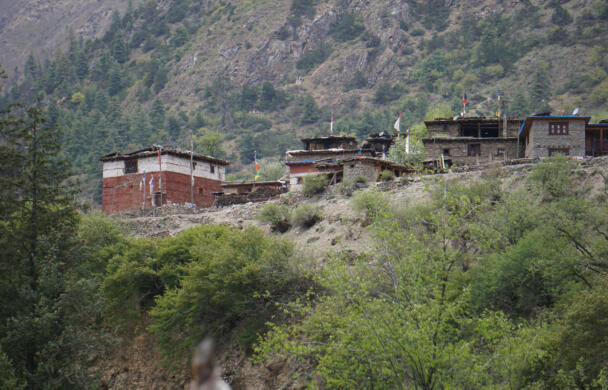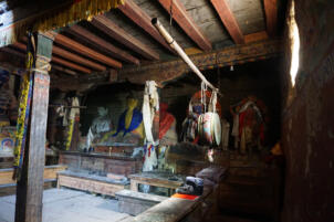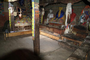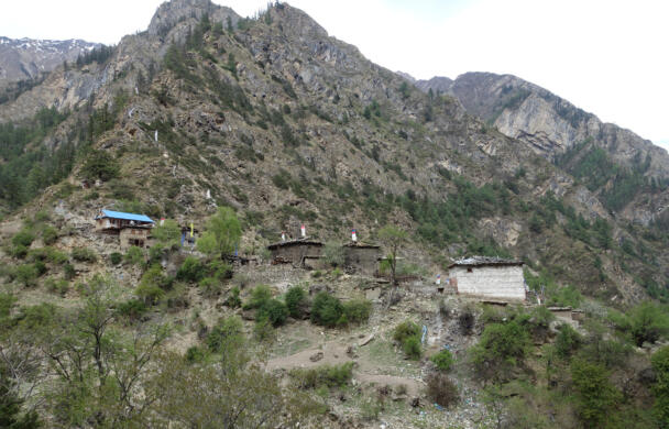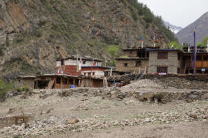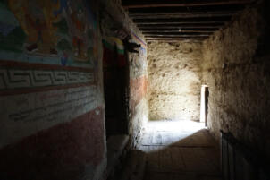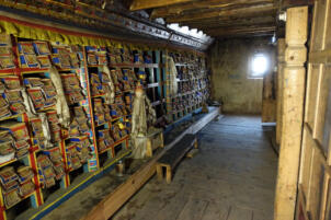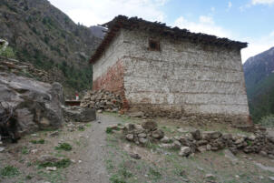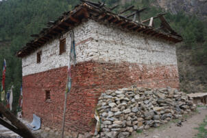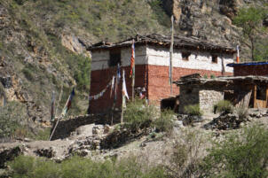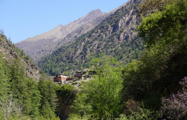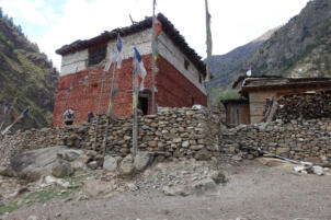 The village of Pugmo in Lower Dolpo is located beside the river Yulung Khola in a northwest side valley of the Phoksundo valley. It is a small settlement with around 20 residential houses. The temple is situated on the western side of the village, where the terrain behind the temple slopes steeply towards the river. Due to its exposed location and its red and white colour, it is the first building visible from a distance. Approaching from the east a doorway-chörten leads into the village and passing between the residential buildings further to the temple. A new prayer-wheel house is standing at some distance southeast of the temple.