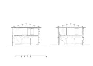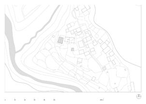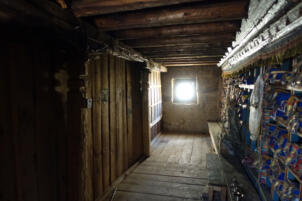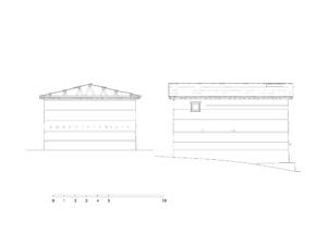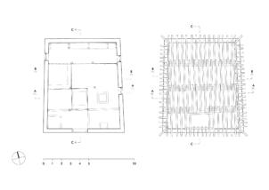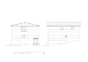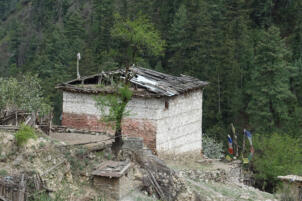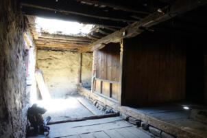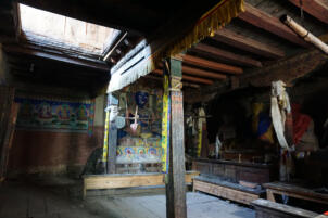 The roofing of the temple consists of a flat pitched construction and is covered with wooden planks. The walls of the temple building, as well as the residential houses around, show a construction typical of this region, made of stone walls with wooden tie rods running horizontally, through which the facades are structured.