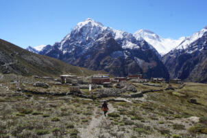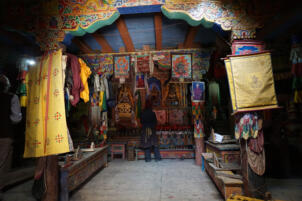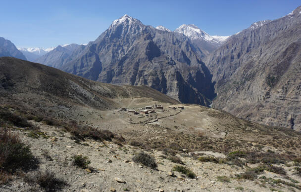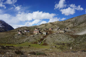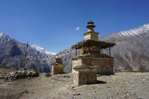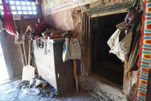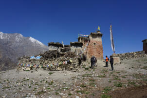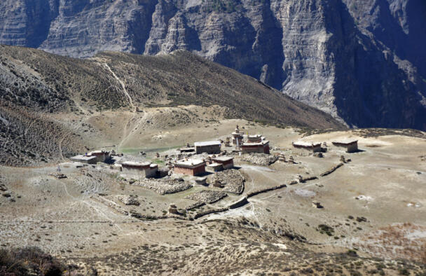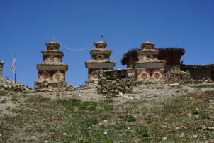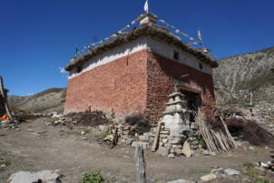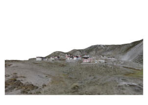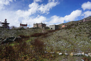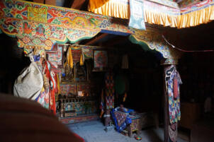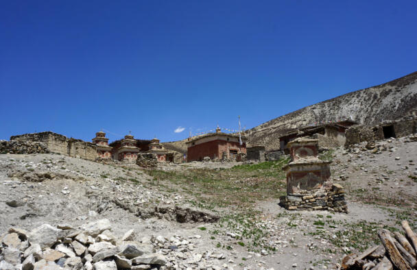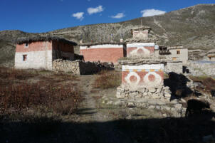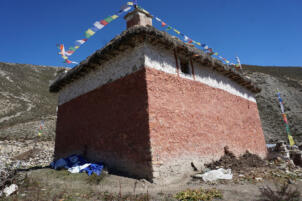 Samling lies in a grassy valley basin that opens up to the south, surrounded by snow-capped mountain ranges. Above the settlement the way leads from the north at an altitude of 4248 metres down to the southern terrain of the valley at an altitude of 4152 meters above sea level. To the west, a steep path leads into the river valley 200 meters below, which leads to Shey Sumdo. The monastery, usually called Samling Gompa or Yangton Gompa, turnted into a chief monastery of Bon for the region. The foundation goes back to the 12th century, the heredity line of the Yangal lineage provides the abbot up to the present day. At the present day Lama Sherab Tenzin leads Samling monastery. The monastery complex consisted of thirteen buildings and numerous chörten as well as large mani-walls (see Kind 2012). The building structures of the entire ensemble are spread across the sloping terrain, with an extension of 195 meters in a north-south direction and 135 meters in an east-west direction. In recent years, some buildings have been rebuilt, while others have disappeared.