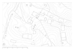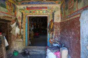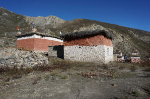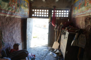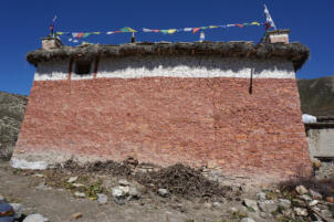 Today´s main gompa, the Serkhang (A), is located on the north side of the ensemble. Its entrance faces southeast where a forecourt gives space for meetings and celebrations. Its external dimensions are 10.78 x 7.54 meters, with a total height to the roof surface of between 5.00 and 5.30 meters. The walls are made of solid stone masonry which was redwashed in the lower and whitewashed in the upper part. Two small windows are located on the south-eastern façade, another on the south-western side, which illuminate the rooms of the upper floor. The wooden construction of the flat roof and the attic which is fastened with dried plants and stone slabs protrudes above the whitewashed part.