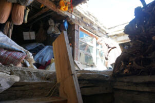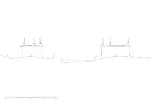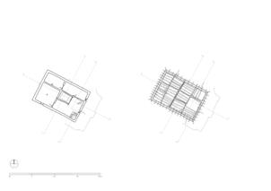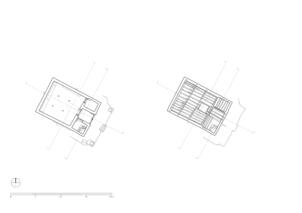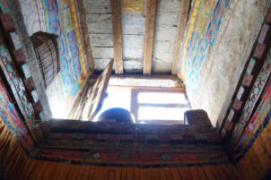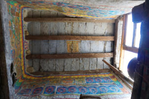 On the upper floor lie residental and storage rooms, which are all accessed via a small open courtyard in front of the lantern´s window, which faces southeast. The construction of the glazing suggests that this area was originally open. The two adjoining rooms on the north-east side, which are just under two meters wide, were designed as side rooms. The larger room on the south-west side, which also has a window, is more carefully equipped in comparison; its walls are plastered and painted. The room is square with a side length of 4.18 meters and a ceiling height of 1.95 meters. In the center of the room, a pillar supports the main beam of the ceiling. Via a ladder one can get from the open courtyard of the first floor up to the roof, which is decorated with the characteristic corner structures and flags.