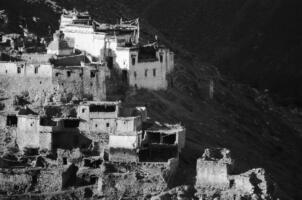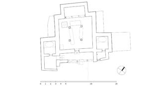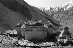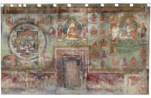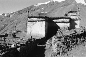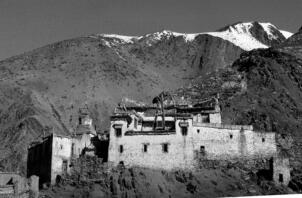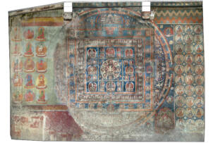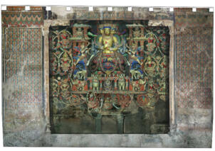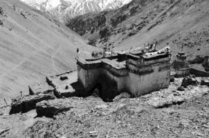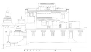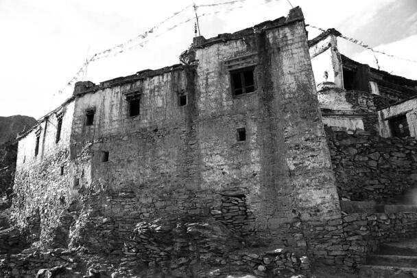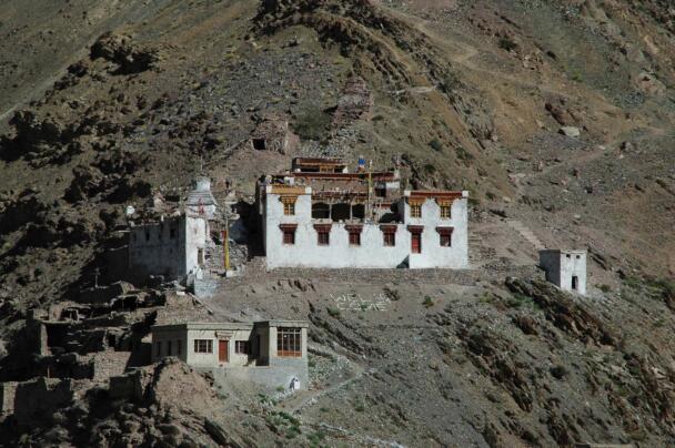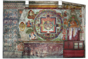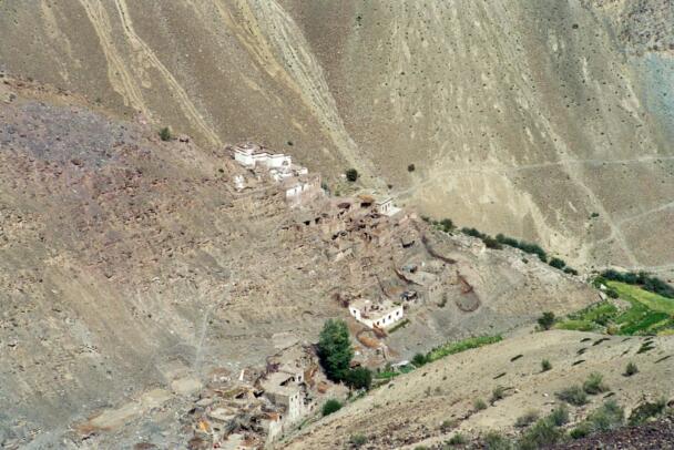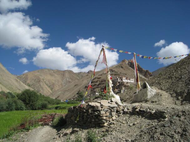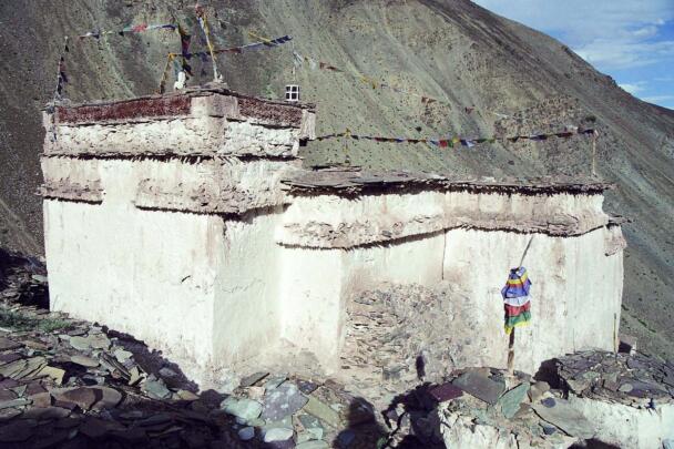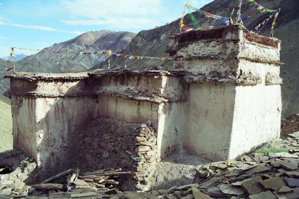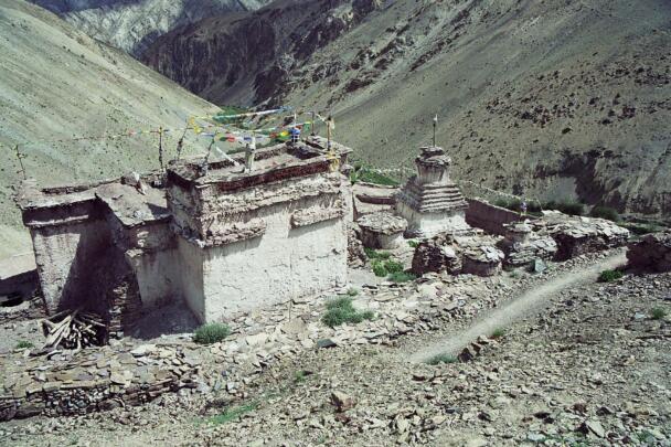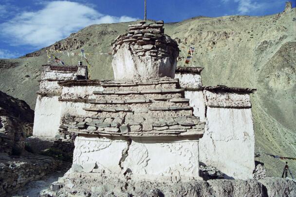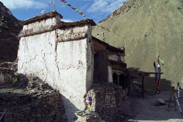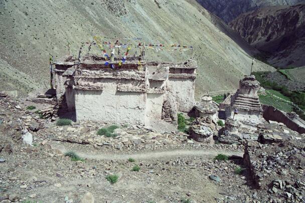 The village of Sumda Chung is located about 40 kilometres (airline) west of Leh. Sumda Chung can be reached in half a day’s walk from the road running alongside the Zanskar River. The footpath follows the waterways continuously uphill to the village that consists of only a few houses. The temple is situated on the crest of the ascending slope on the eastern side of the settlement. The foundation of the temple can be dated back to the 11th century. The temple consists of a main room with an apse, a roofed porch and two lateral rooms which can be accessed from the porch. They have been added to the main room in a later period. The entrance of the temple faces southeast. The shape of the temple is characterized by an unusual roof-construction above the apse, where the triangularly wooden construction is covered by another flat roof-lantern. The main room with the apse, which today is the remaining part of the original structure, is built on solid rock, whereas the porch and parts of the lateral rooms have foundations of stone masonry. These stone terraces have obviously been sliding away several times in the past, most probably as a consequence of rain waters coming down the mountain and causing the breakaway of the porch and parts of the two rooms for at least two times. Remains of older constructions can be traced by analysing the wooden beam structure of the roof of these parts of the building.