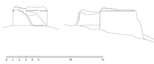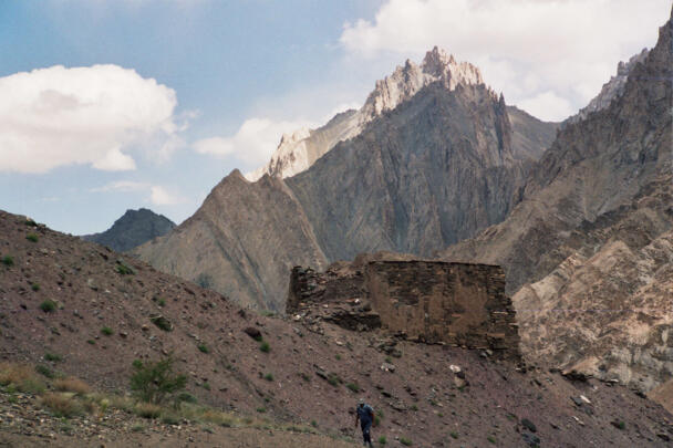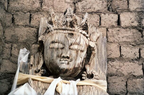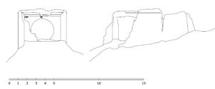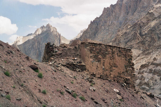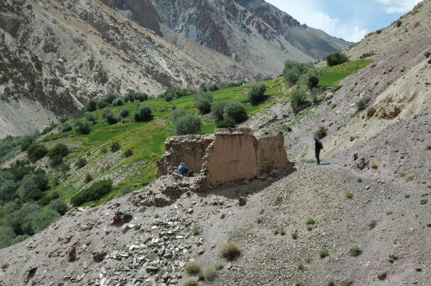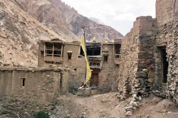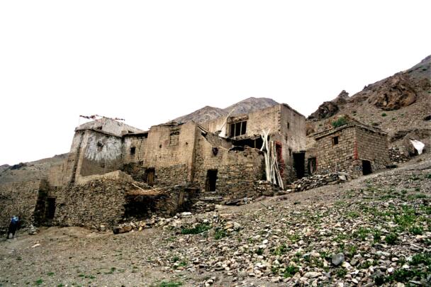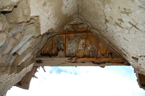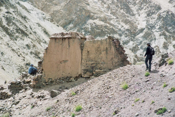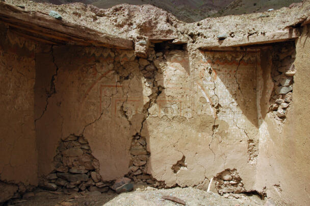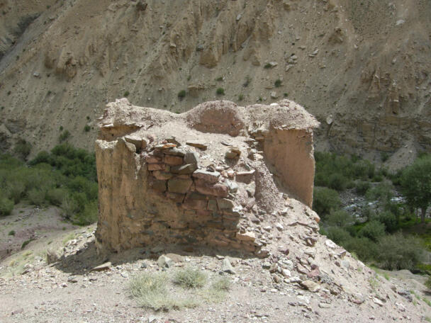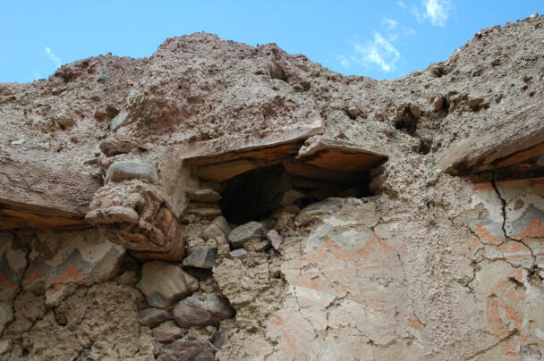 The village of Sumda Chen is located about 45 kilometres (airline) west of Leh. The village can be reached following the road along the lower Zanskar River, six kilometres south-west of Sumda Chung. Near the village of Sumda Chung two ruins of early temples can be found. One temple ruin is situated on the southern side of the village and is more widely known because of its wooden sculptures including an image of Maitreya. The ruins of the second, smaller temple are located about half a kilometre east outside the village, on a small rock formation on the northern hill slope. It consists of a square room with fragments of a lantern ceiling and a few preserved mural fragments. The former interior space was 4.23 metres long and 4.05 metres wide, with a height of about 3.1 metres. The entrance once faced southeast. On the northern wall a lion console that supported the painted lantern ceiling is still preserved, although not in a good condition. The walls on the northern side of the temple ruin were added later, probably to stabilize the structure.