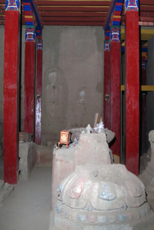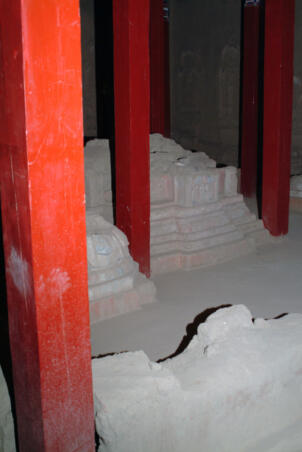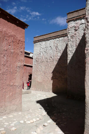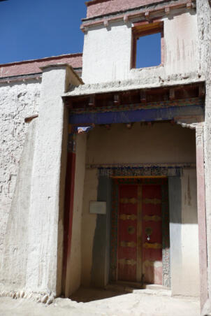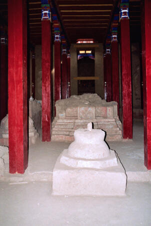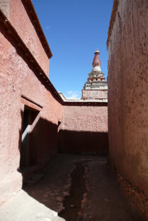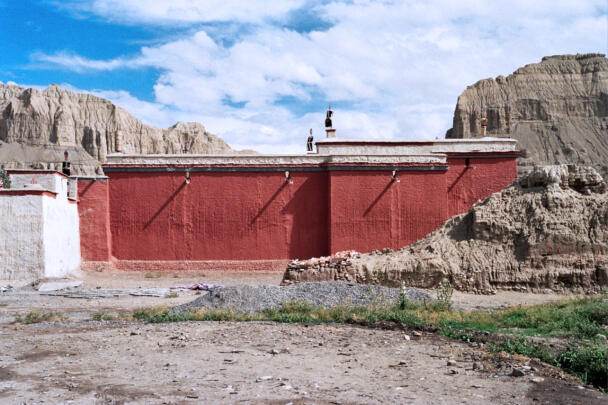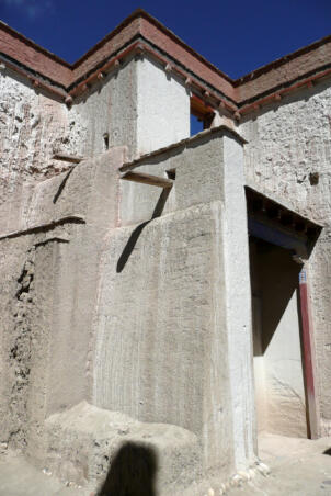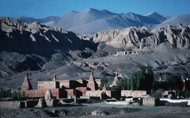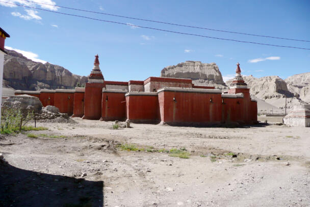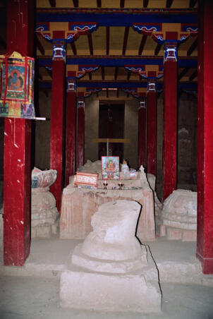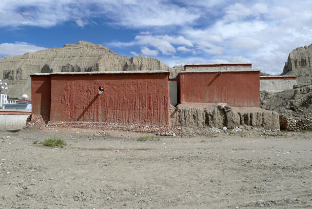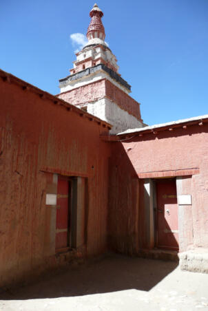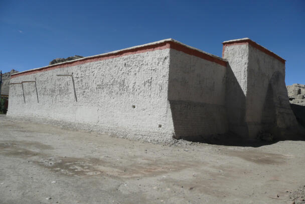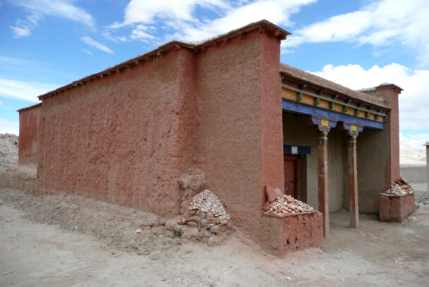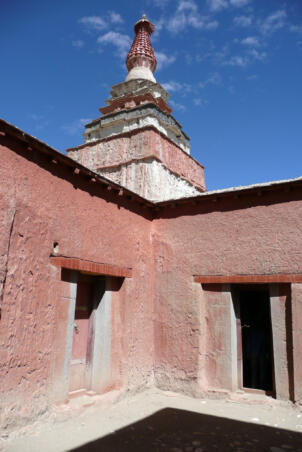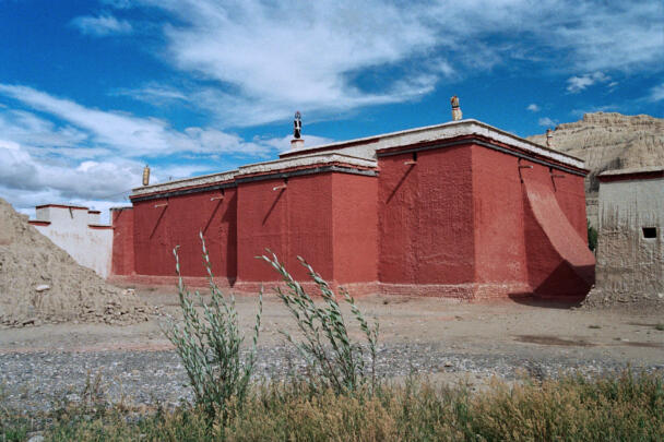 Tholing is located in the Ngari district of the Tibet Autonomous Region, about 120 kilometres (airline) southeast of Nako. The monastery was founded in the year 996 by Yeshe-Ö, the king of Guge. For several centuries the village represented the centre of Tibetan Buddhism in the kingdom of Guge. The Tholing monastery remained a thriving religious centre even in the 13th and 14th century, retaining its indigenous artistic tradition even under Central Tibetan influence. The ruling elite of the later kingdom of Guge (1400–1630) made Tholing a centre of the newly established Gelugpa School and had numerous monuments built at Tholing itself and on the slopes below their castle at Tsaparang. In 1933 the scientific mission led by the Italian tibetologist Giuseppe Tucci entered the ancient monastery of Tholing in West Tibet and, for the first time in almost a millennium, revealed the existence of its temples and towering chörten to the world. The despoliations perpetrated during the Cultural Revolution (1966 – 1976) ultimately swept away the temples of Tholing from their irreplaceable artistic legacy leaving bare walls behind. Some temples survived as ruins with most of their sculptures and paintings destroyed. Between 1996 and 1999 a project team sponsored by the Cultural Relics Bureau of the Autonomous Region of Tibet worked on archaeological excavations, repair and rebuilding of the ancient buildings. The ruined walls were rebuilt, new pillars were erected and new roofs were laid. The monastic compound of Tholing is situated on the northern side of the old village, on a plain area in front of the sloping terrain of the Sutlej river valley. The buildings are orientated mainly along a northeast-southwest axis. The monumental mandala-shaped Yeshe-Ö Temple or Gyatsa lies on the south-western side of the enclosed area and is the largest building of the complex, it measures 63.3 x 56.8 metres along the main axes. The temple consists of a central, cross-shaped building, surrounded by a ring of 17 chapels (formerly 20 chapels according to Tucci’s description) which can be accessed through an open ambulatory, covering a total floor area of approximately 2115 square metres. The entrance hall is situated on the north-eastern side. The central building consists of a main room that once placed a four-fold Vairocana sculpture of which only the cross-shaped throne has remained today. Around the centre four main chapels with free-standing thrones are located in the cardinal directions. The corners of the Yeshe-Ö Temple are marked by four chörten in the intermediate directions. Four larger chörten (called the Inner Quartet) were erected at the ordinal points outside the temple. Three more temples are preserved in the complex that lies northeast of the Yeshe-Ö Temple: the Red Temple (Dukhang), the White Temple and the Golden Temple (Serkhang). While the Red Temple and the White Temple stylistically correspond to the period of the later kingdom of Guge, the Serkhang obviously goes back to the foundation period. This building was described as the most sacred of the whole monastery, built in three storeys diminishing upwards. The upper floors were accessed by means of small external stairs leading to narrow porches with pilasters and cornices of sculptured wood (Tucci 1933:169). The White Temple lies in the south of the Serkhang. The rectangular building is orientated along the northwest-southeast axis, its entrance with a small portico supported by two pillars is situated on the south-eastern side. The hall measures 21.0 x 18.0 metres with a small apse (1.45 x 3.50 metres) on the north western side. The interior walls are 6.4 metres high, 42 pillars support the ceiling. Between 2002 and 2009 a highly qualified restoration took place, so that the wall paintings are well preserved. The Red Temple (Dukhang) is situated between the Yeshe-Ö Temple and the White Temple. The building is orientated along a northeast-southwest axis with its entrance on the north eastern side, where an open courtyard and later erected structures were attached. The temple consists of three parts: a narrow entrance hall (2.82 x 14.75 metres with a height of 4.54 metres), an 18-pillared front hall (12.99 x 17.98 metres with a height of 5.94 metres) and a 16-pillared apse (12.32 x 11.87 metres with a height of 6.03 metres). All walls of the Red Temple and all ceilings are covered with mural paintings, some of them derive from later renovations.