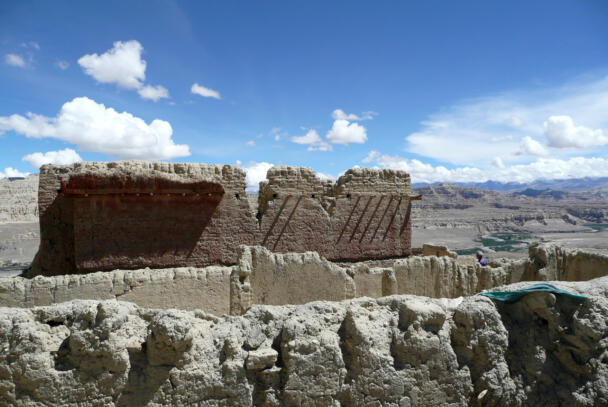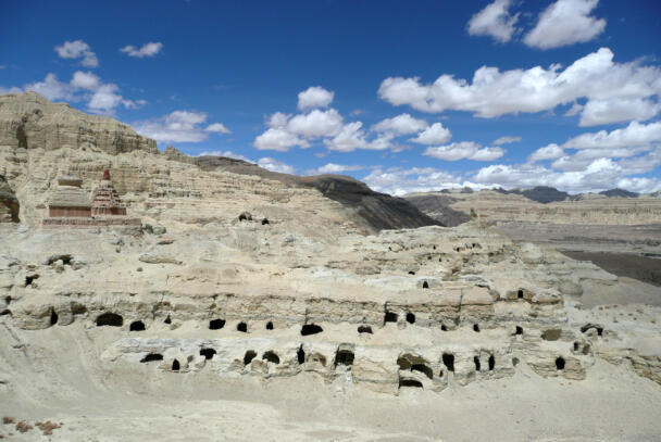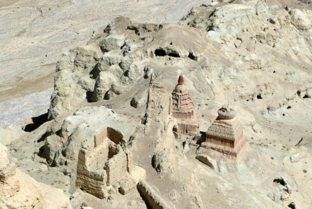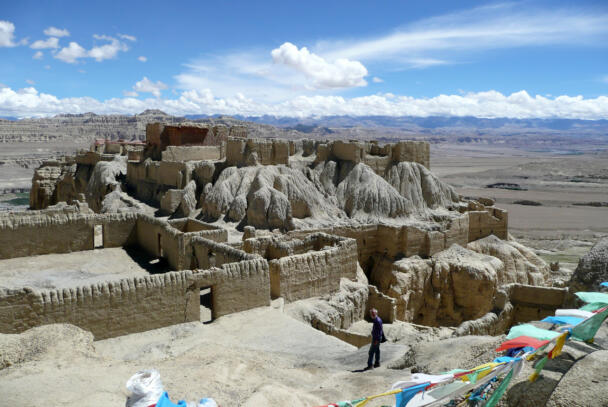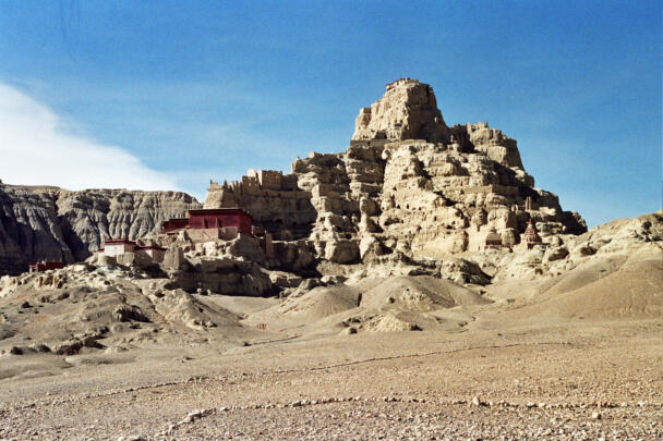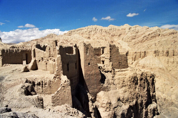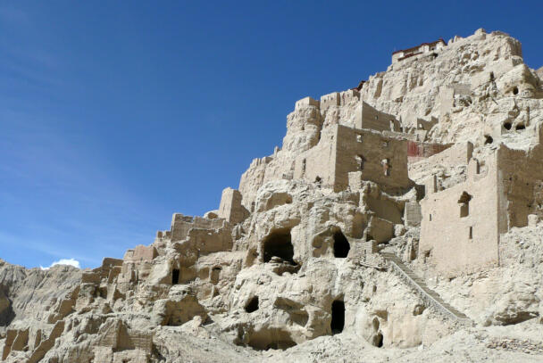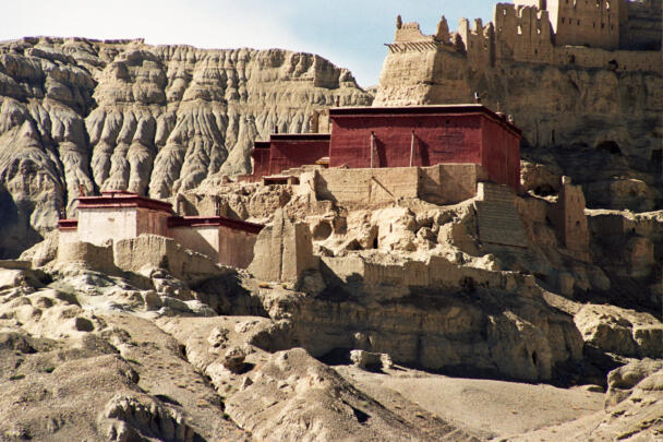 Tsaparang is located in the Ngari district of the Tibet Autonomous Region, about 12 kilometres (airline) west of Tholing. In the 15th century Tsaparang replaced Tholing as the seat of the kings of the Guge kingdom. During the following centuries many temples were built around this important site, a great number of them have fallen victim of the Chinese Cultural Revolution. Nonetheless parts of the buildings in Tsaparang are still preserved until the present day, providing evidence of the rich cultural history of the place. The ruins showing a huge fortress perched on a pyramid-shaped rock rising about 150-180 metres at the end of a long narrow spur. The rock contains numerous tunnels and caves that have been carved out. At the very top the royal quarter and the palace were located. At the foot of the fortress between the ruins of the village four temples are preserved which are of particular interest in respect of their paintings and clay sculptures. The two larger temples – the White Temple (Lhakhang Karpo) and the Red Temple (Lhakhang Marpo) – are located on the north-eastern side of the cliff. The small Tara temple lies 20 metres distant on the eastern side of the White Temple, and the Yamantaka Temple closely to the Red Temple on its south-eastern side. Another small temple named Mandala Temple is located behind the residential quarters on the eastern side of the peak.