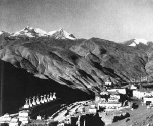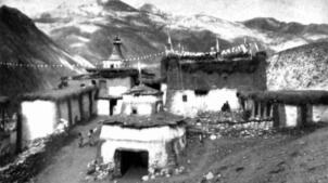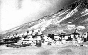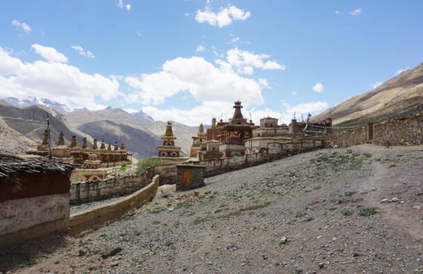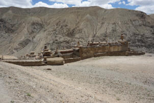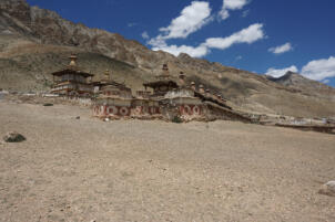 On the western side of the temples a great chörten is said to contain the relics of the founder. Its base covers 9.00 metres on every side. On the southern side of the monastic compound another very large chörten with a square base of about 25.50 metres is situated. Photos taken in the year 2005 show that in this period the chörten was already under construction.