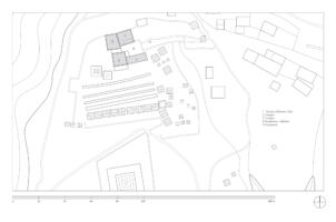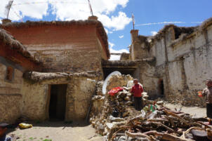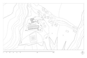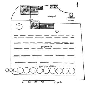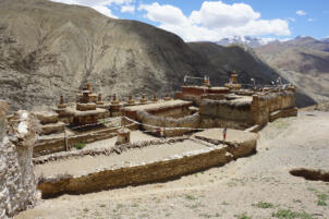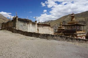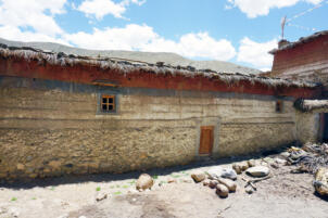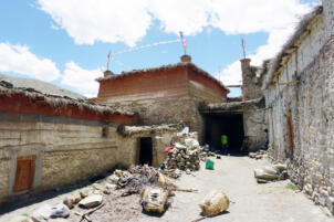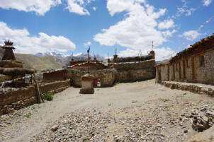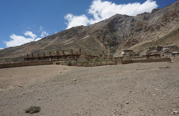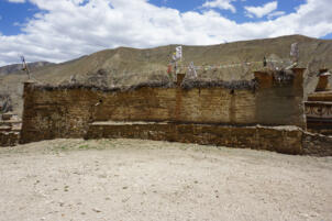 The total area of the Yangtse monastery – together with the temples, courtyards, adjoining buildings and rows of chörten, – measures 6600 square metres with a perimeter along the enclosing wall of 410 metres. The ensemble consists of three temples and a great number of chörten. Some are located near the temples, but most of them stand on the southern and eastern side of the temples, for example an impressive row of nine large chörten with a prayer wall in front flank the southern side. Between the southern chörten row and the building complex lies a stony field structured with rows of mani-walls, which are oriented in east-western direction, occupying the central area of the compound. The entrance to the walled area is located on the eastern side, where a door-chörten gives access to the first courtyard. Another door lies on the south side of the surrounding wall. On the west side of this longitudinal courtyard is the entrance to an older courtyard, which give access to the three temples and the residental building.