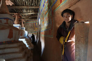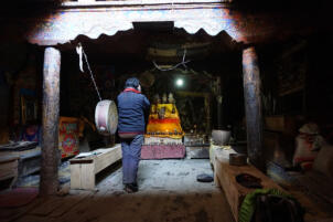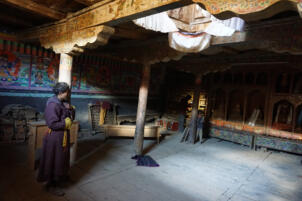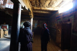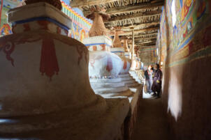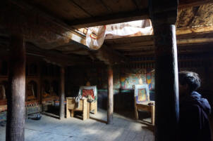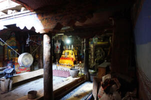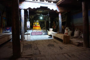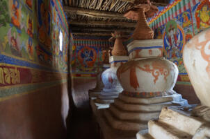 Temple no. 1, also named chörten hall, is located on the southern side of the courtyard, with its entrance faces north. The one-storey temple has the form of a narrow hall with an interior of about 18.00 x 4.00 metres, containing a row of eight chörten and an obviously repainted mural decoration. The room is lit by two windows on the north side and two windows on the south side of the room. The temple no. 2 lies directly next to the temple no. 1, on its western side. From the entrance on the ground floor one crosses low rooms used as stables, and then, via a staircase, reaches the anteroom of the temple on the upper floor. The floor area of the interior is about 8.00 x 9.00 metres. The ceiling is supported by by six pillars, an open lantern to the upper floor illuminates the room. The temple no. 3 lies opposite temple no. 2, on the northern side of the ensemble. Between the two buildings, a roofed area leads to the entrance on the south side of the temple, which forms the anteroom of the hall. The assembly hall has a trapezoidal floor plan, the room depth is about 10 metres, on the front wall the width is 7.80 metres, on the back wall 8.60 metres. Likewise in temple no. 2, the interior is structered by six pillars with an open lantern to the upper floor that illuminates the room. On the northern side shelfs and an alter with an impressive collection of statues are located.